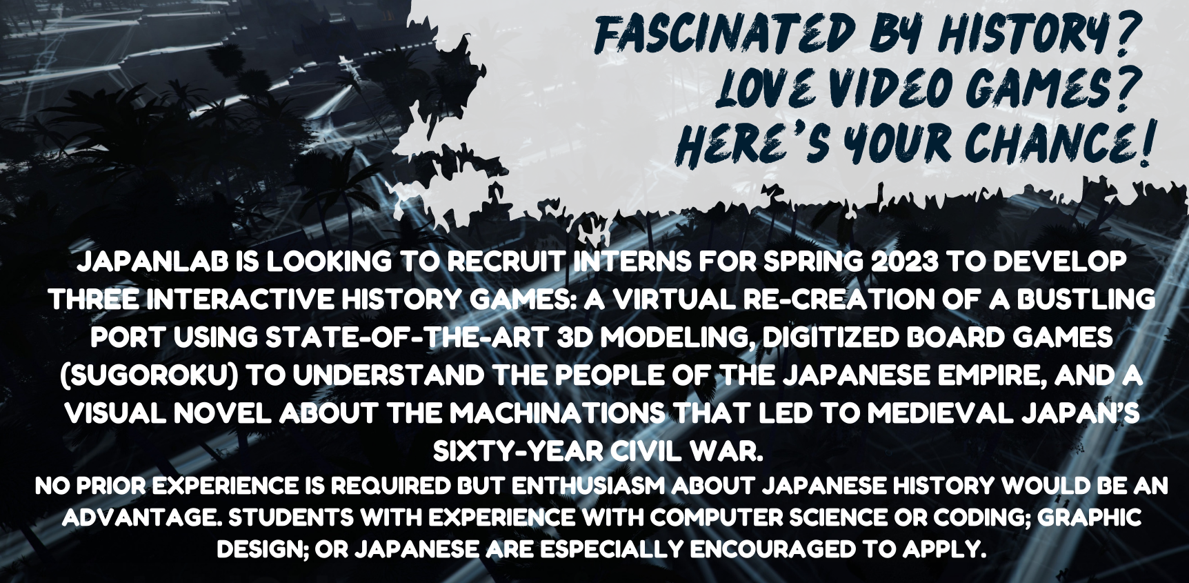 Projects for Spring 2023 Playing at Empire: Imperial Japan through Sugoroku Between 1873-1945, Japan built a massive Pacific Empire. Its first colonies, Taiwan and Korea, were internationally recognized, like British control in India and French in Vietnam. Later conquests, such as the puppet regimes in Manchuria and mainland China, were rejected by the US and UK, leading to WWII in the Pacific. Negotiating the Kenmu Transformation Bandit attacks ran rampant, the powerful ignored judicial summons, and the imperial court was crystallizing into two warring camps. Something had to change. In the year 1332, three paths beckoned—emperor, warrior-judges, or munificent warlord—and many factions made their choices Creating a Virtual Model of Yokohama Have you ever wanted to build a city? In this project, we will learn 3D modeling techniques in Autodesk Maya and Unity3D to recreate the treaty port of Yokohama, an international boomtown, at its peak. In 1882, Yokohama was one of the fastest-growing cities in Japan. Find out more Find out more Find out more